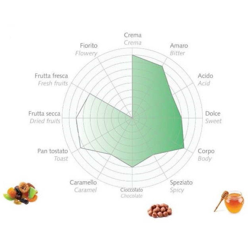 Made for the Bar Line, espresso coffee and milky specialties (cappuccinos, lattes, macchiatos, etc) due to its composition 50 % Arabica coffee beans from Latin America and 50 % high quality oriental Robusta coffee beans.