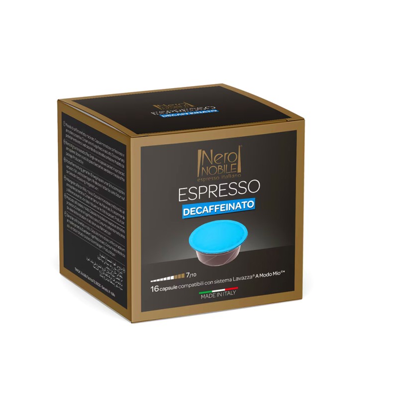 Decaffeinated coffee in plastic capsules (A Modo Mio system), with a caffeine content of 0.1% and full-bodied, was created for coffee lovers who are intolerant to caffeine and for those who want to enjoy coffee in the evening without fear of affecting the nervous system.