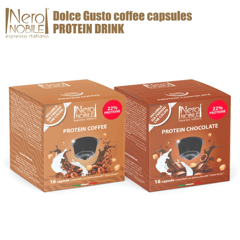 Nero Nobile Protein Chocolate Dolce Gusto is a soluble hot drink that is delicious and dense, with an authentic chocolate taste and an added protein (22%).