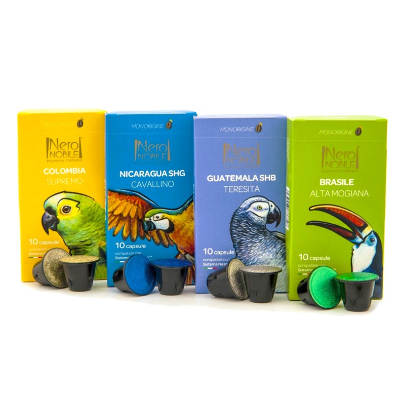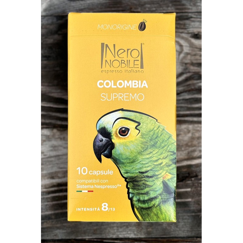 Кофе капсулы Nero Nobile Columbia Supremo в системе Nespresso для сладкого, шоколадного вкуса с фруктовыми нотками, которые могут отдавать карамелью, яблоком и красными фруктами, такими как ягоды.
