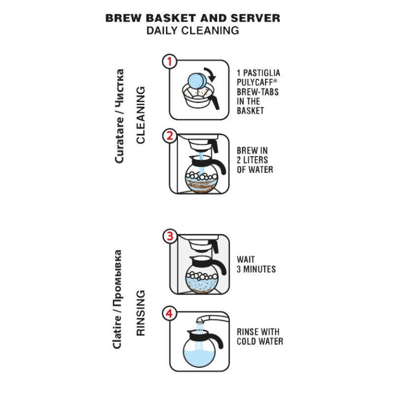 | Инструкция | Использование (Filter Drip): 1 таблетка в корзину фильтра, полный цикл заваривания без кофе, затем 2 цикла промывки чистой водой. Использование (Термосы/Графины): 1 таблетка в емкость, залить горячей водой (>80°C), время воздействия 15 минут, тщательная промывка. Рекомендуемая частота: Ежедневно для профессионального использования (HoReCa) или еженедельно для дома. |